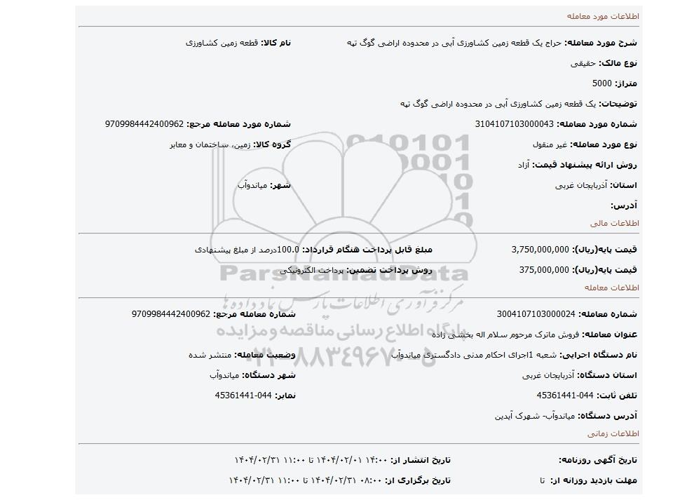 | شرح مورد معامله: حراج یک قطعه زمین کشاورزی آبی در محدوده اراضی گوگ تپه | نام کالا: قطعه زمین کشاورزی | |