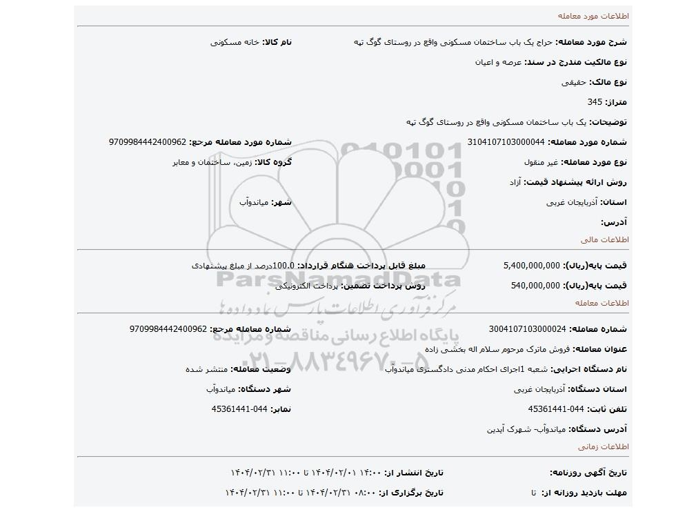مزایده یک باب ساختمان مسکونی واقع در روستای گوگ تپه, مزایده، یک باب ساختمان مسکونی واقع در روستای گوگ تپه