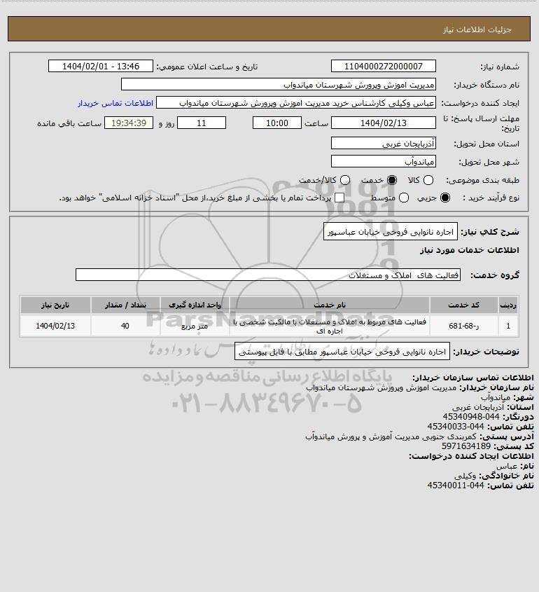 شرح کلی نیاز: اجاره نانوایی فروخی خیابان عباسپور