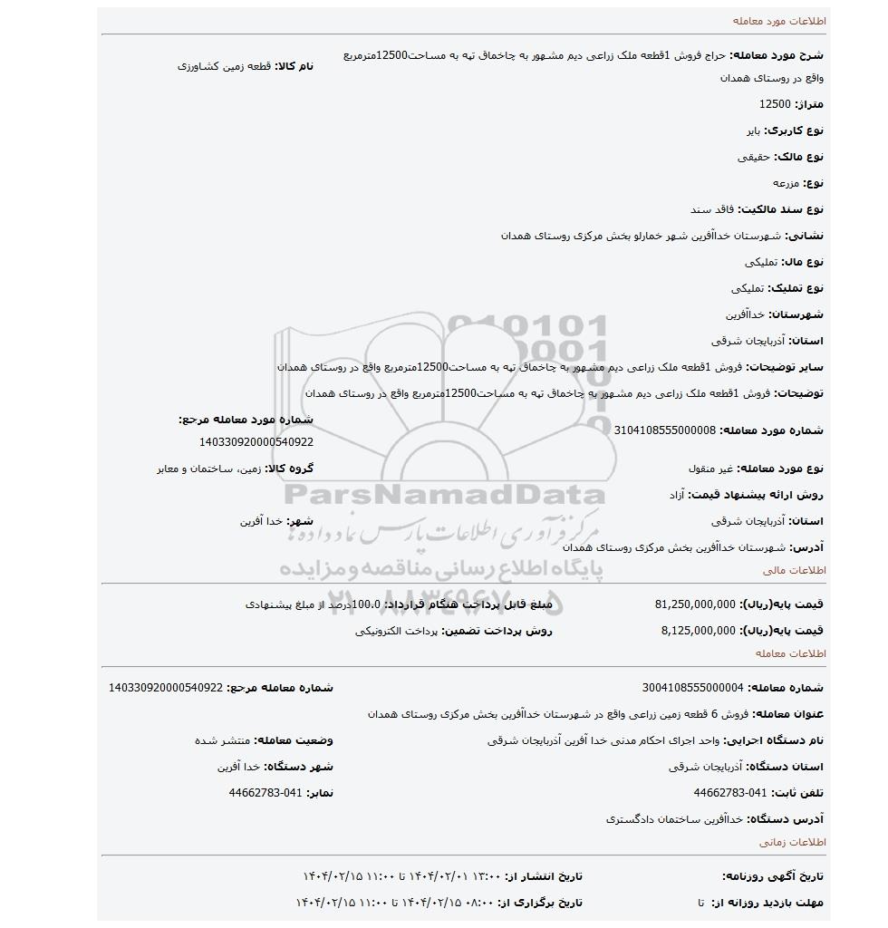 عنوان معامله: فروش 6 قطعه زمین زراعی واقع در شهرستان خداآفرین بخش مرکزی روستای همدان