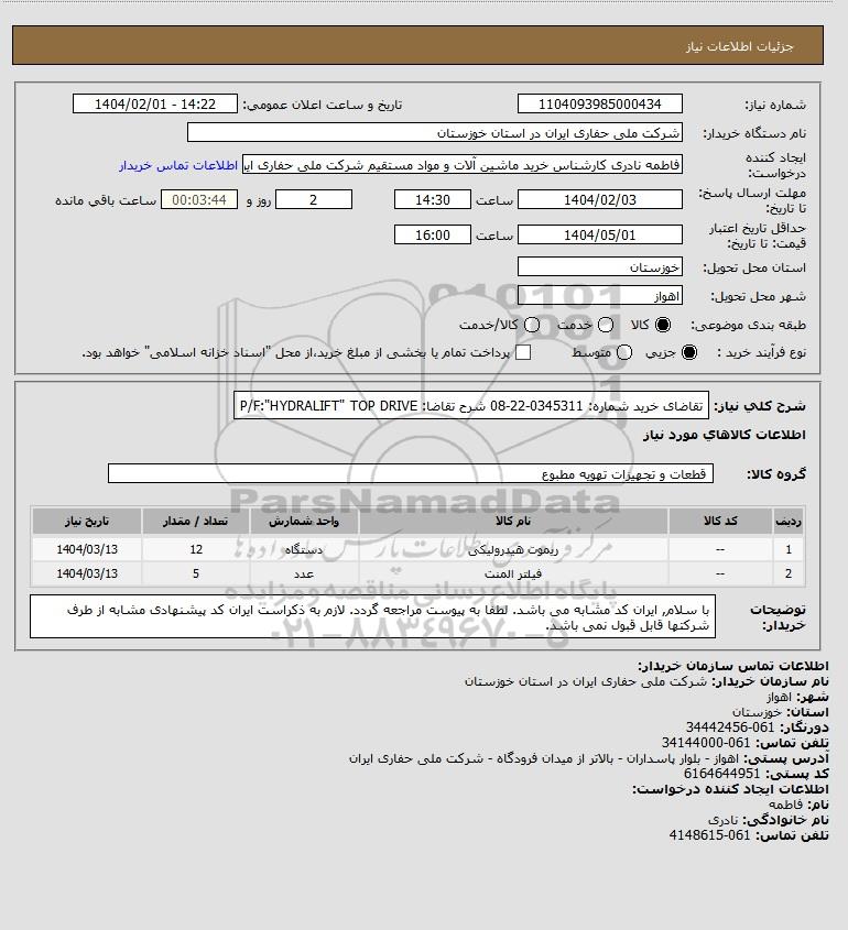شرح کلی نیاز: تقاضای خرید شماره: 0345311-22-08 شرح تقاضا: P/F:"HYDRALIFT" TOP DRIVE