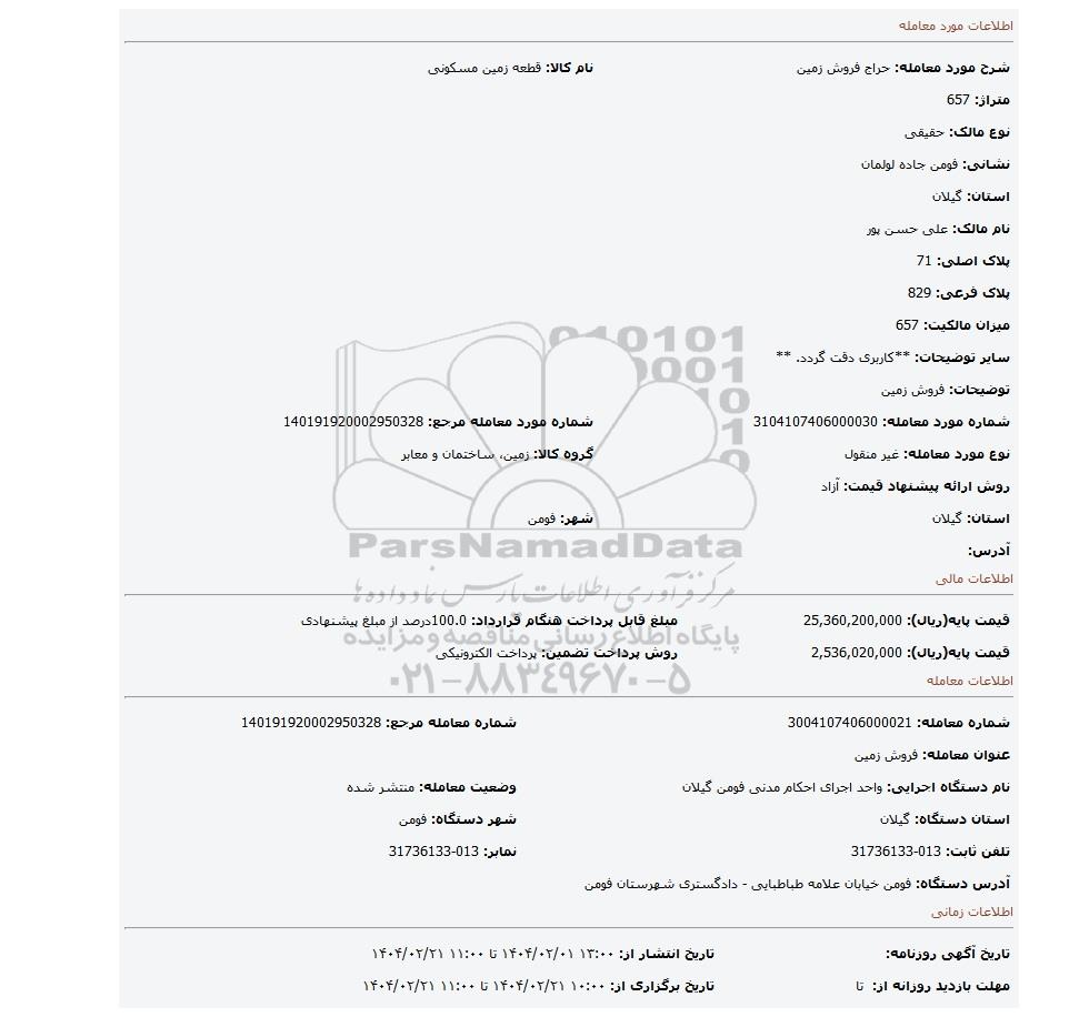 | شماره مورد معامله: 3104107406000030 | شماره مورد معامله مرجع: 140191920002950328 | |