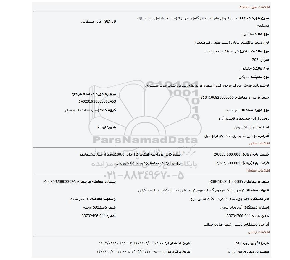 | شماره مورد معامله: 3104106821000005 | شماره مورد معامله مرجع: 140235920003302453 | |