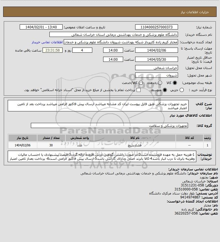 نام دستگاه خریدار:دانشگاه علوم پزشکی و خدمات بهداشتی درمانی استان خراسان شمالی