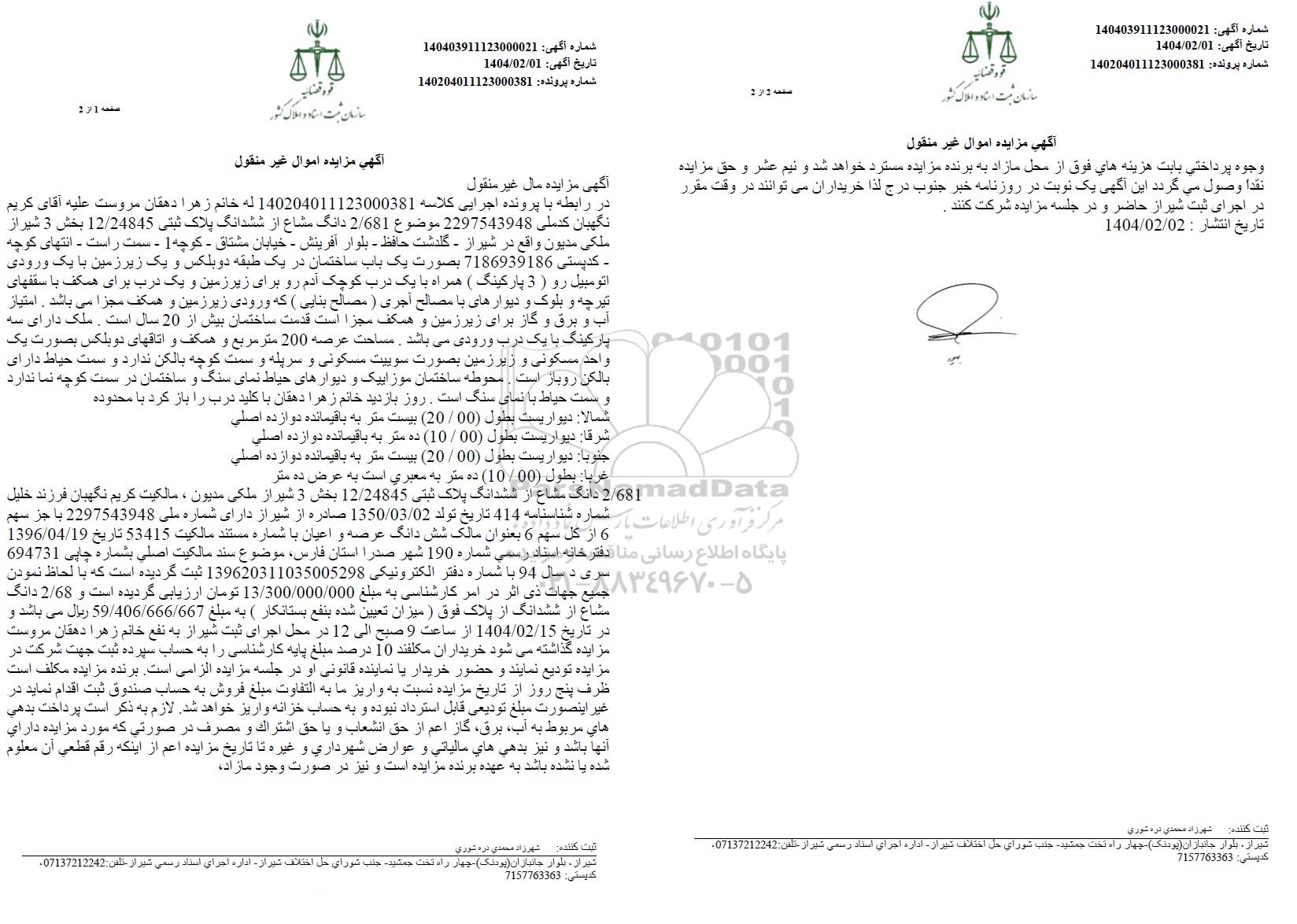 مزایده فروش 2/681 دانگ مشاع از ششداگ پلاک ثبتی 12/24845 بخش 3 شیراز، مساحت عرصه 200 متر مربع