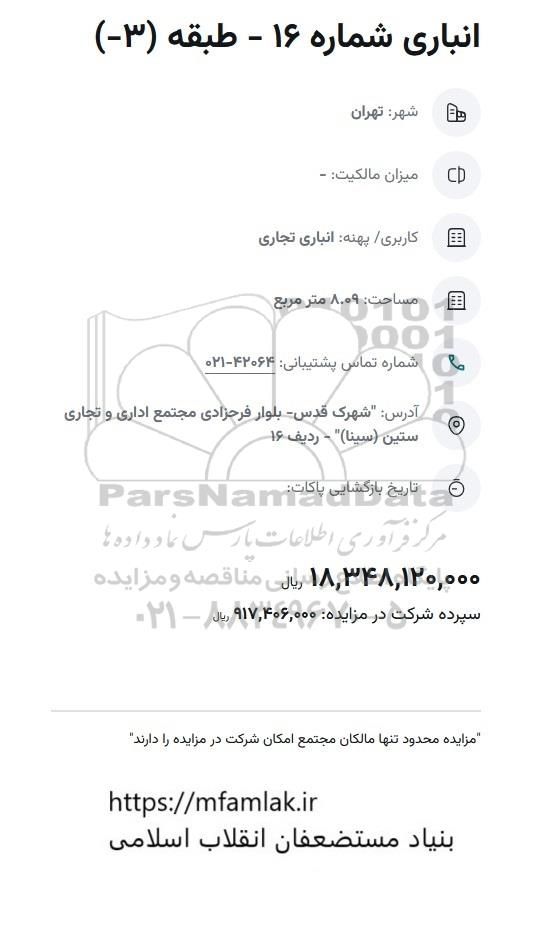 مزایده عمومی مزایده انباری شماره 16- طبقه 3- برگزار میگردد. از کلیه افراد متخصص و شرکتهای واجد شرایط دعوت به عمل میآید تا در این مزایده با کد خبرگزاری پارس نماد : 8907639 شرکت نمایند تاریخ شروع مزایده : 1404/02/01 مهلت شرکت در مزایده: تا پایان روز 1404/02/21 مکان برگزاری اموال واگذاری استانهای تهران و دستهبندیهای مربوط به این حراجی واگذاری ورزشگاه، پارکینگ، غرفه و بوفه, املاک و زمین میباشد.