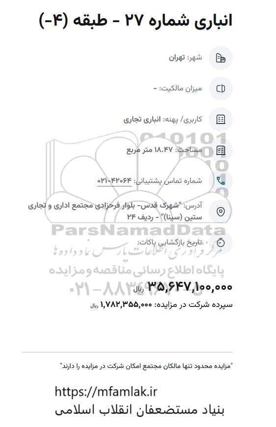 مزایده انباری شماره 27 - طبقه (4-), مزایده انباری شماره 27 - طبقه (4-)