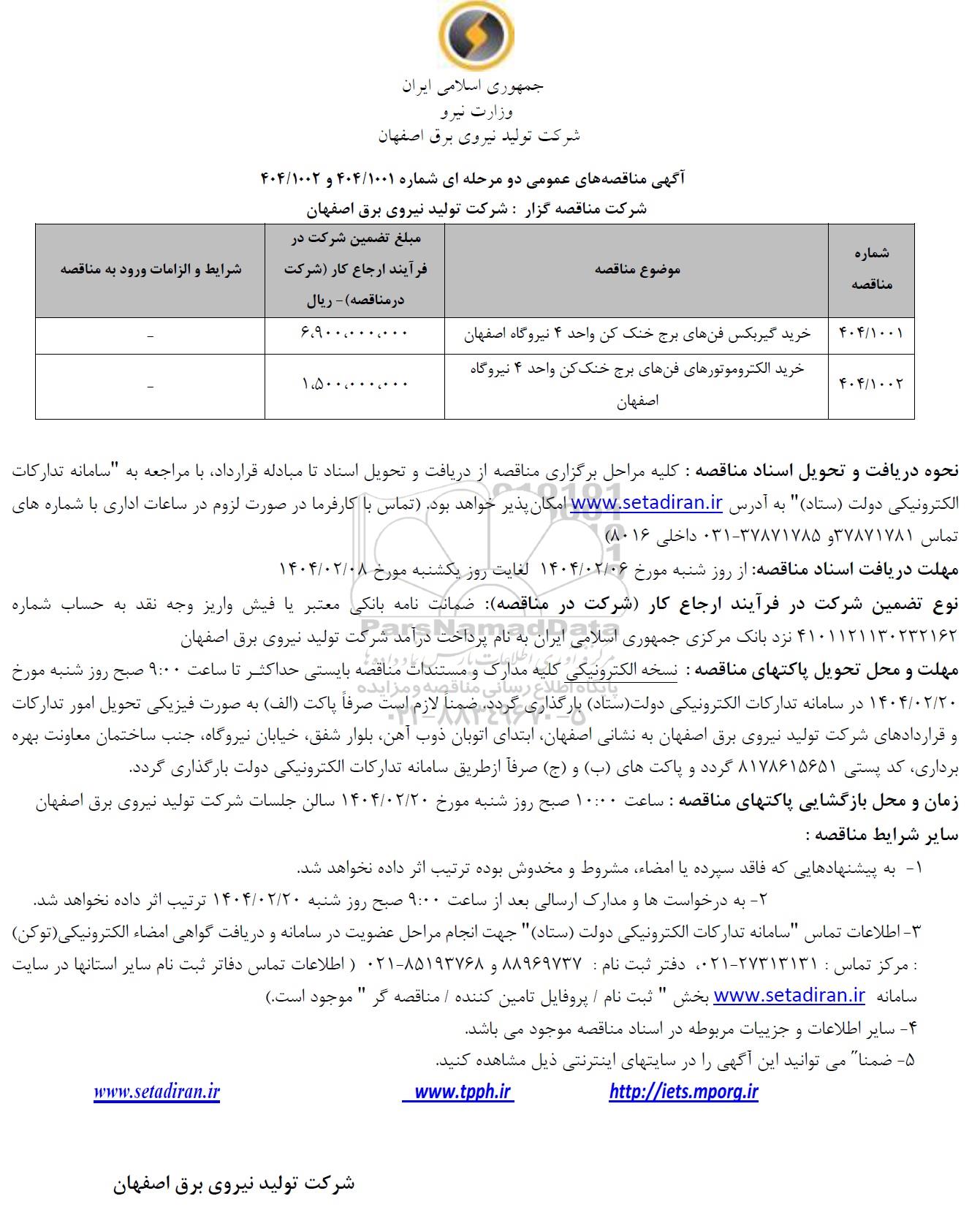 | 404/1002 | خرید الکتروموتورهای فنهای برج خنک کن واحد 4 نیروگاه اصفهان | 1.500.000.000 |