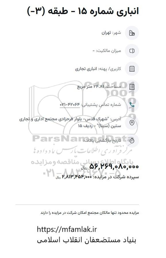 مزایده عمومی مزایده انباری شماره 15- طبقه 3- برگزار میگردد. از کلیه افراد متخصص و شرکتهای واجد شرایط دعوت به عمل میآید تا در این مزایده با کد خبرگزاری پارس نماد : 8907675 شرکت نمایند تاریخ شروع مزایده : 1404/02/01 مهلت شرکت در مزایده: تا پایان روز 1404/02/21 مکان برگزاری اموال واگذاری استانهای تهران و دستهبندیهای مربوط به این حراجی واگذاری ورزشگاه، پارکینگ، غرفه و بوفه, املاک و زمین میباشد.
