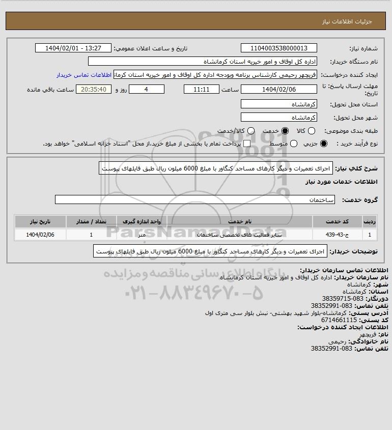 شرح کلی نیاز: اجرای تعمیرات و دیگر کارهای مساجد کنگاور با مبلغ 6000 میلون ریال طبق فایلهای پیوست