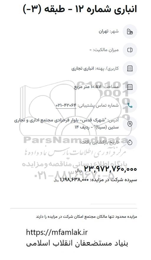 مزایده عمومی مزایده انباری شماره 12- طبقه 3- برگزار میگردد. از کلیه افراد متخصص و شرکتهای واجد شرایط دعوت به عمل میآید تا در این مزایده با کد خبرگزاری پارس نماد : 8907733 شرکت نمایند تاریخ شروع مزایده : 1404/02/01 مهلت شرکت در مزایده: تا پایان روز 1404/02/21 مکان برگزاری اموال واگذاری استانهای تهران و دستهبندیهای مربوط به این حراجی واگذاری ورزشگاه، پارکینگ، غرفه و بوفه, املاک و زمین میباشد.