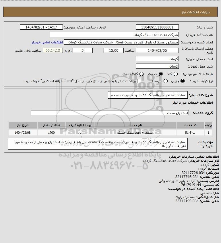 شرح کلی نیاز: عملیات استخراج زغالسنگ کک شو به صورت سطحی