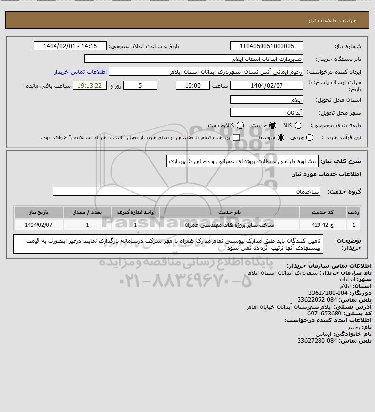 شرح کلی نیاز: مشاوره طراحی و نظارت پروژهای عمرانی و داخلی شهرداری