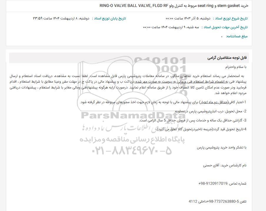 به استحضار می رساند استعلام خرید تقاضای مذکور در سامانه معاملات پتروشیمی پارس قابل مشاهده است. لطفا نسبت به مشاهده دریافت اسناد استعلام و ارسال پیشنهاد فنی به انضمام شرایط استعلام فنی و مالی به پیوست به صورت مهر شده در پاکت ب و پیشنهاد مالی در پاکت ج در مهلت مقرر وعينا مطابق با شرایط استعلام ، اقدام فرمایید و در صورت عدم امکان تامین کالا انصراف خود را از طریق سامانه اعلام نمایید در صورت ارایه هرگونه پیشنها دفنی و مالی مغایر با شرایط استعلام ، پیشنهادات دریافتی مردود اعلام خواهد شد.