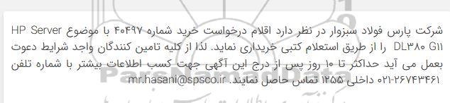 شرکت پارس فولاد سبزوار در نظر دارد اقلام درخواست خرید شماره 40497 با موضوع HP Server 380 را از طریق استعلام کتبی خریداری نماید لذا از کلیه تامین کنندگان واجد شرایط دعوت بعمل می آید حداکثر تا 10 روز پس از درج این آگهی جهت کسب اطلاعات بیشتر با شماره تلفن 021-26743461 داخلی 1255 تماس حاصل نمایند mr.hasani@spsco.ir