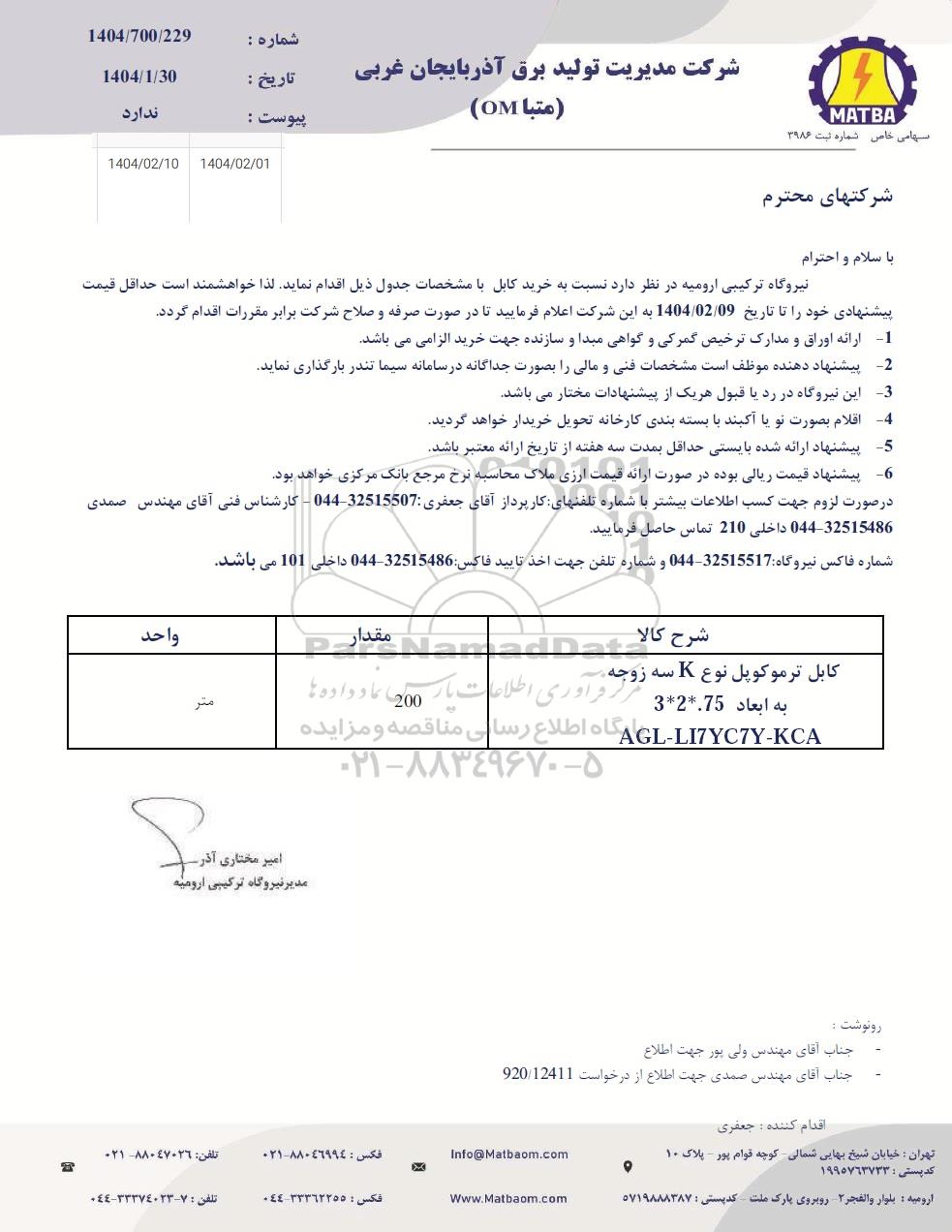 نیروگاه ترکیبی ارومیه در نظر دارد نسبت به خرید کابل با مشخصات جدول ذیل اقدام نماید. لذا خواهشمند است حداقل قیمت پیشنهادی خود را تا تاریخ 1404.02.09  به این شرکت اعلام فرمایید تا در صورت صرفه و صلاح شرکت برابر مقررات اقدام گردد.