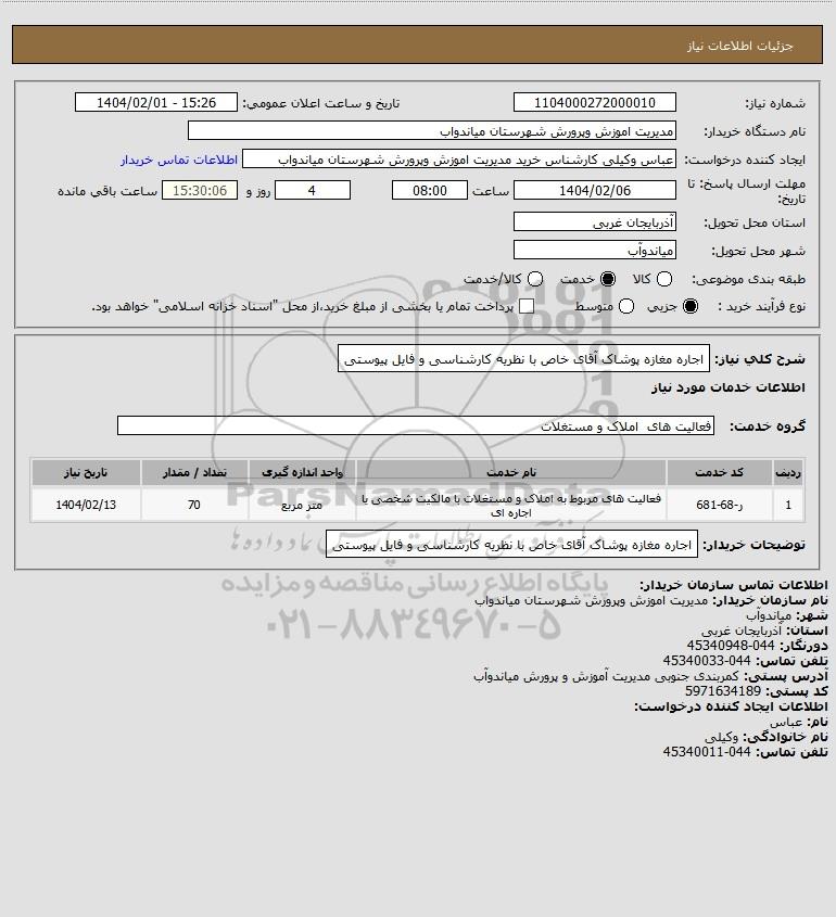 نام دستگاه خریدار:مدیریت اموزش وپرورش شهرستان میاندواب