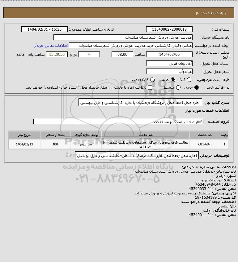 شرح کلی نیاز: اجاره محل (فقط محل )فروشگاه فرهنگیان با نظریه کارشناسی و فایل پیوستی