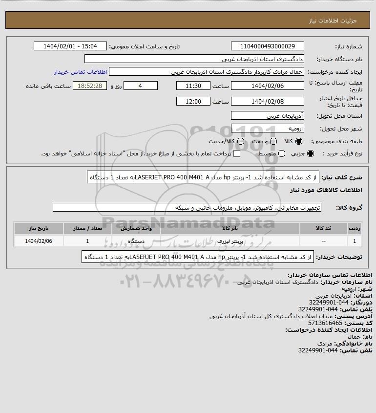 توضیحات خریدار: از کد مشابه استفاده شد 1- پرینتر hp مدل LASERJET PRO 400 M401 Aبه تعداد 1 دستگاه