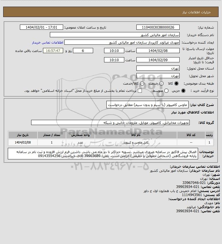 شرح کلی نیاز: ماوس کامپیوتر (با سیم و بدون سیم) مطابق درخواست