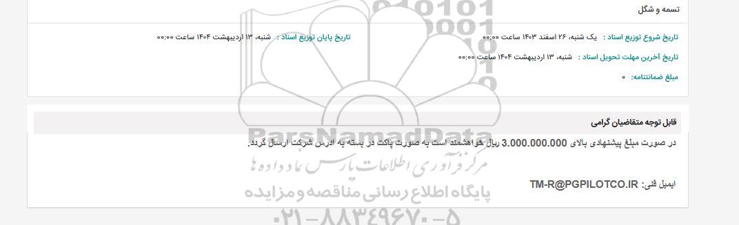در صورت مبلغ پیشنهادی بالای 3.000.000.000 ریال خواهشمند است به صورت پاکت در بسته به ادرس شرکت ارسال گردد.