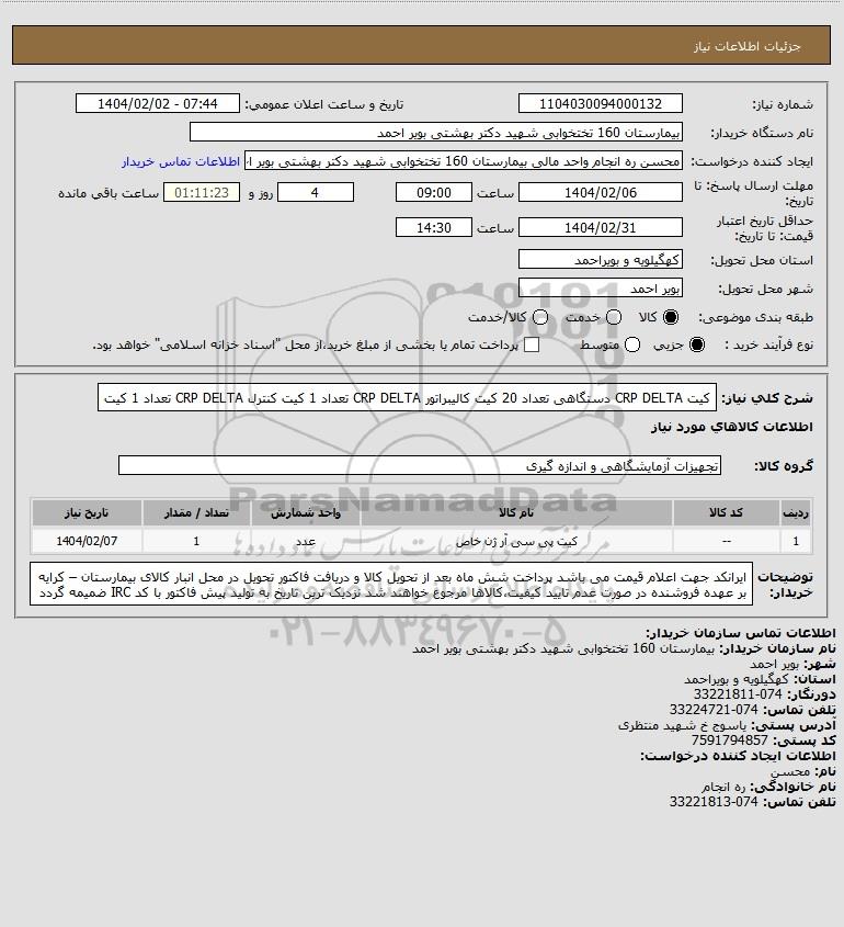 نام دستگاه خریدار:بیمارستان 160 تختخوابی شهید دکتر بهشتی بویر احمد