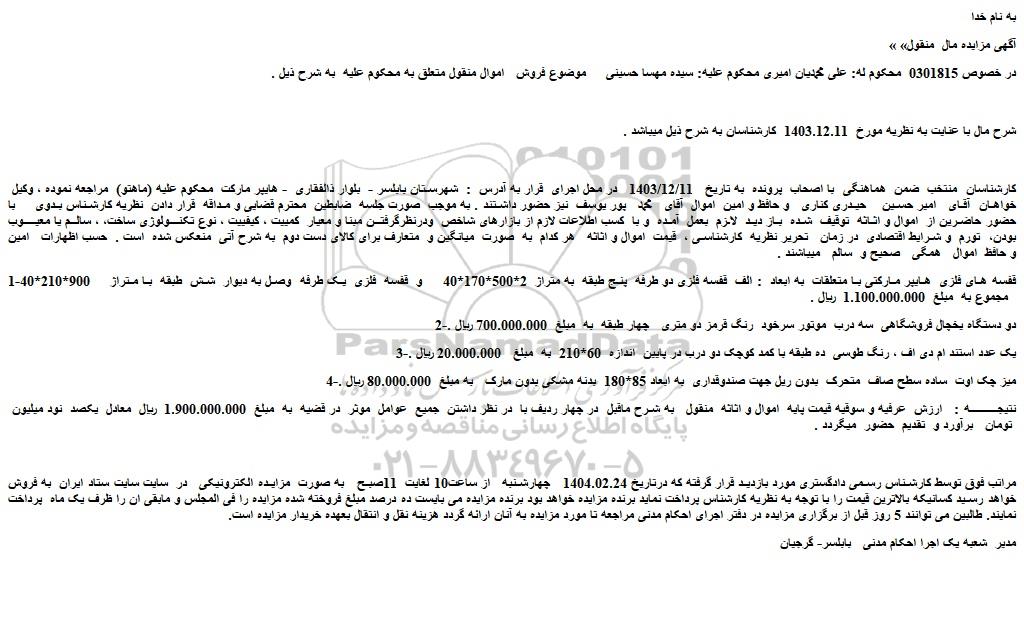 در خصوص 0301815 محکوم له: علی محمدیان امیری محکوم علیه: سیده مهسا حسینی موضوع فروش اموال منقول متعلق به محکوم علیه به شرح ذیل .