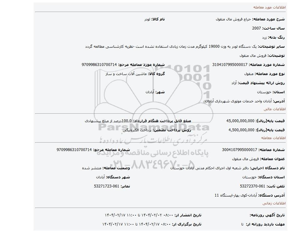 | سایر توضیحات: یک دستگاه لودر به وزن 19000 کیلوگرم مدت زمان زیادی استفاده نشده است -نظریه کارشناسی مطالعه گردد | ||