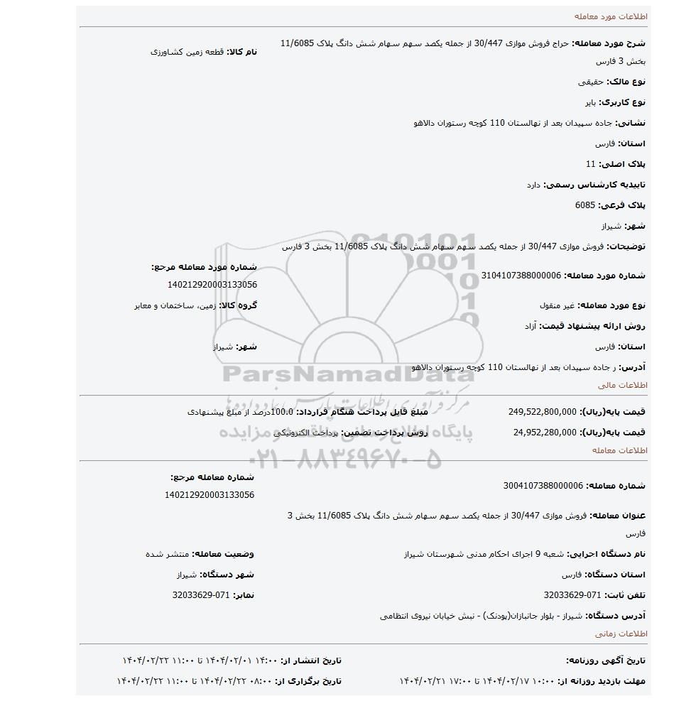 مزایده فروش موازی 30/447 از جمله یکصد سهم سهام شش دانگ پلاک 11/6085 بخش 3 فارس, مزایده، فروش موازی 30/447 از جمله یکصد سهم سهام شش دانگ پلاک 11/6085 بخش 3 فارس