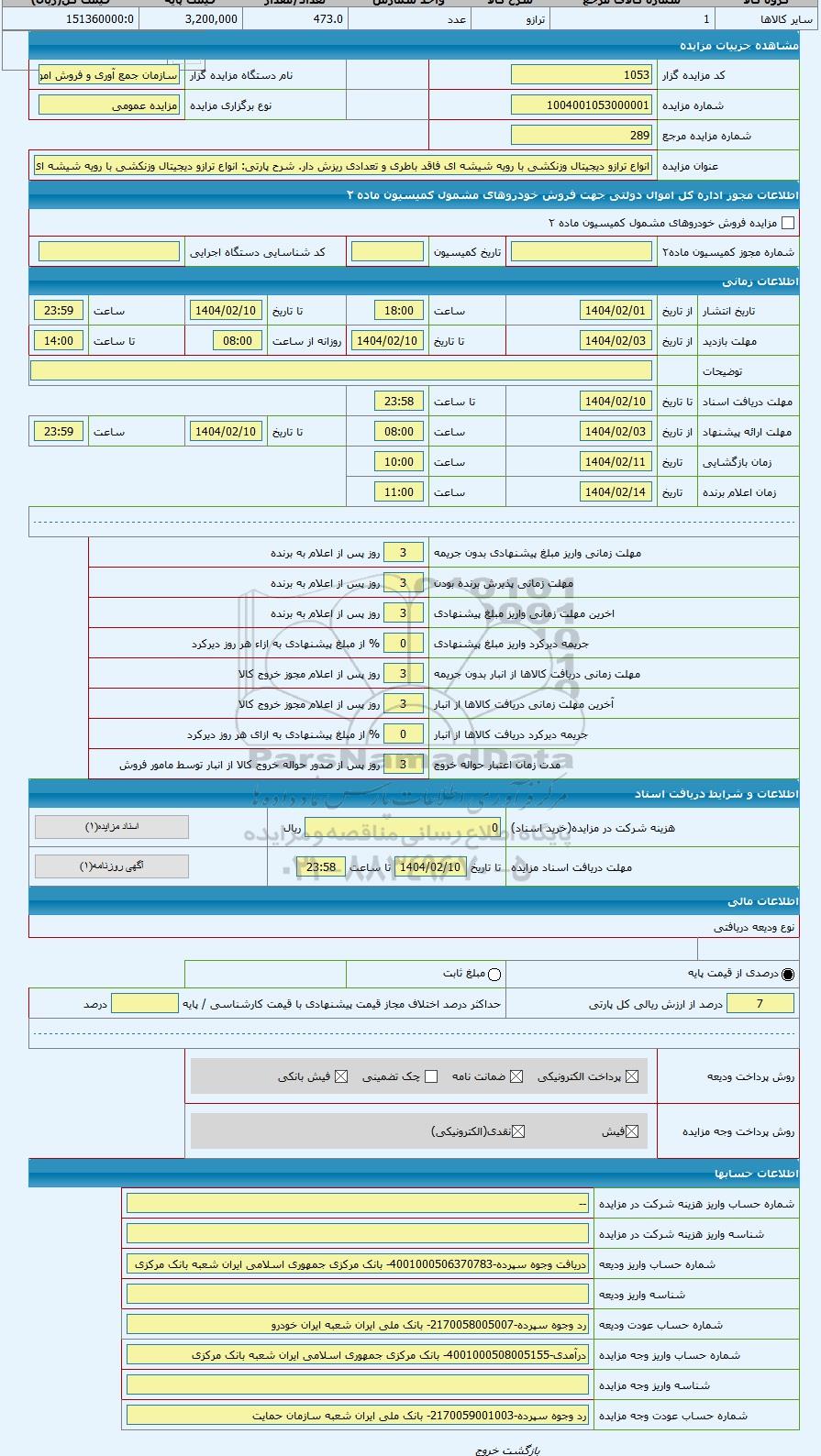 | کد مزایده گزار | 1053 | نام دستگاه مزایده گزار | سازمان جمع آوری و فروش اموال تملیکی | |