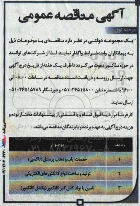یک مجموعه دولتی در نظر دارد مناقصه ای با موضوعات ذیل به پیمانکاران واجد شرایط واگذار نماید.