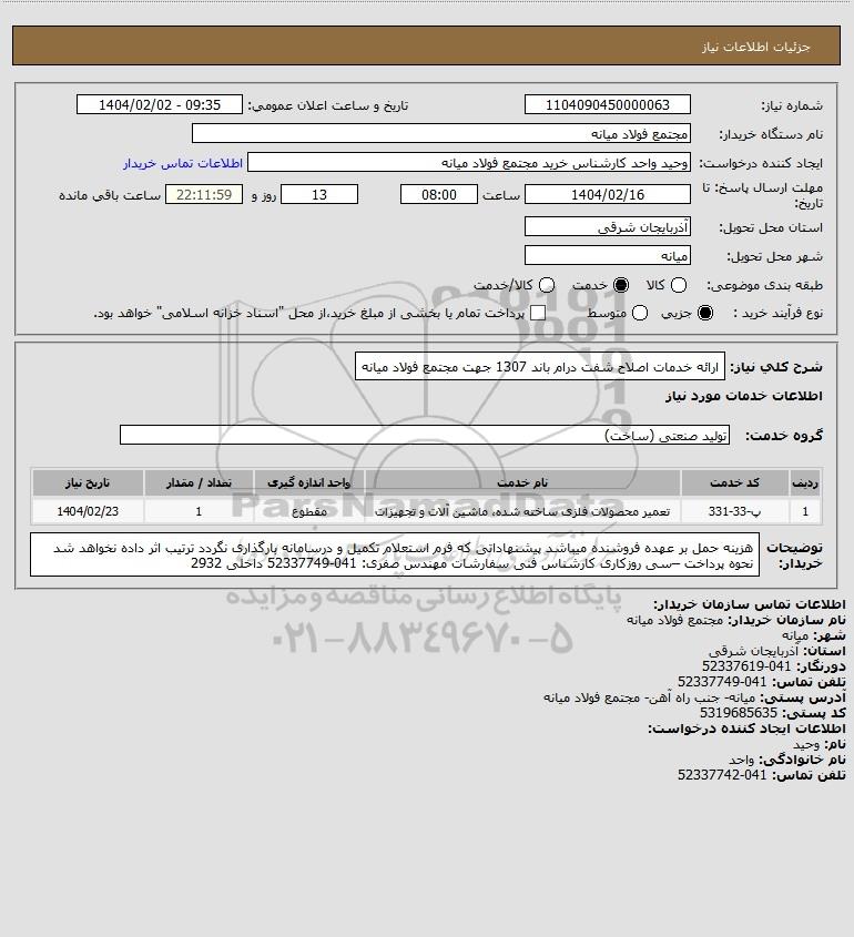 شرح کلی نیاز: ارائه خدمات اصلاح شفت درام باند 1307 جهت مجتمع فولاد میانه