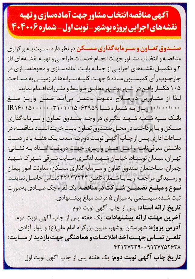 آگهی مناقصه انتخاب مشاور جهت آماده سازی و تهیه نقشه های اجرایی پروژه بوشهر - نوبت اول - شماره 404006