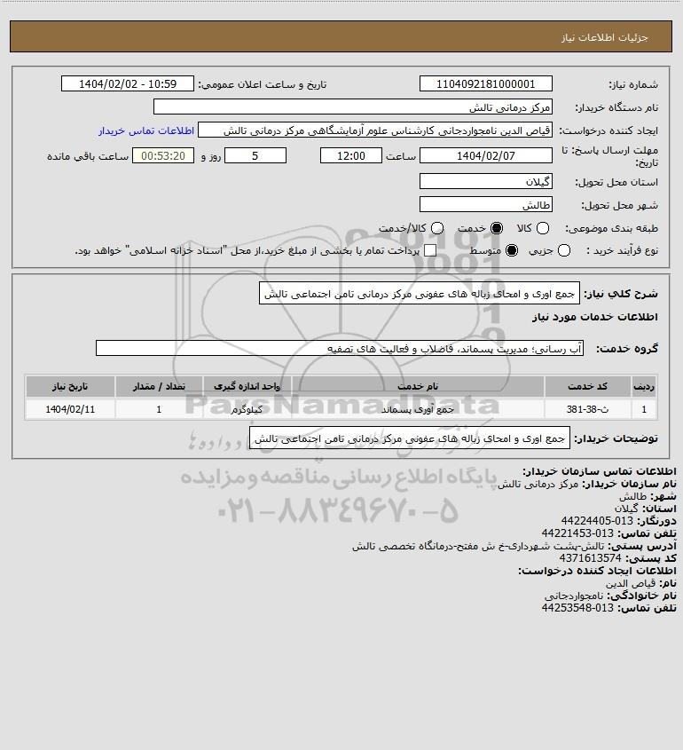 شرح کلی نیاز: جمع اوری و امحای زباله های عفونی مرکز درمانی تامن اجتماعی تالش