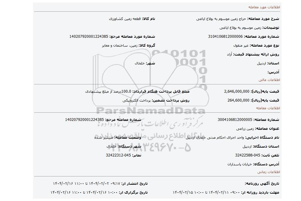 | شرح مورد معامله: حراج زمین موسوم به بولاغ ایاغی | نام کالا: قطعه زمین کشاورزی | |