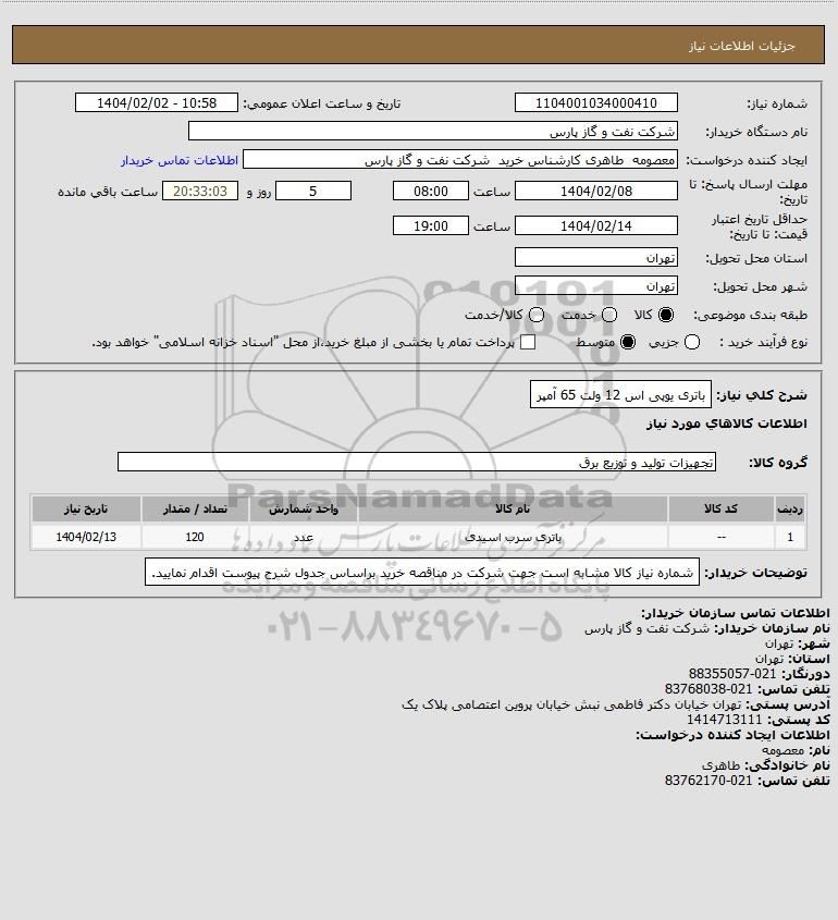 | 1 | -- | باتری سرب اسیدی | عدد | 120 | 1404/02/13 |