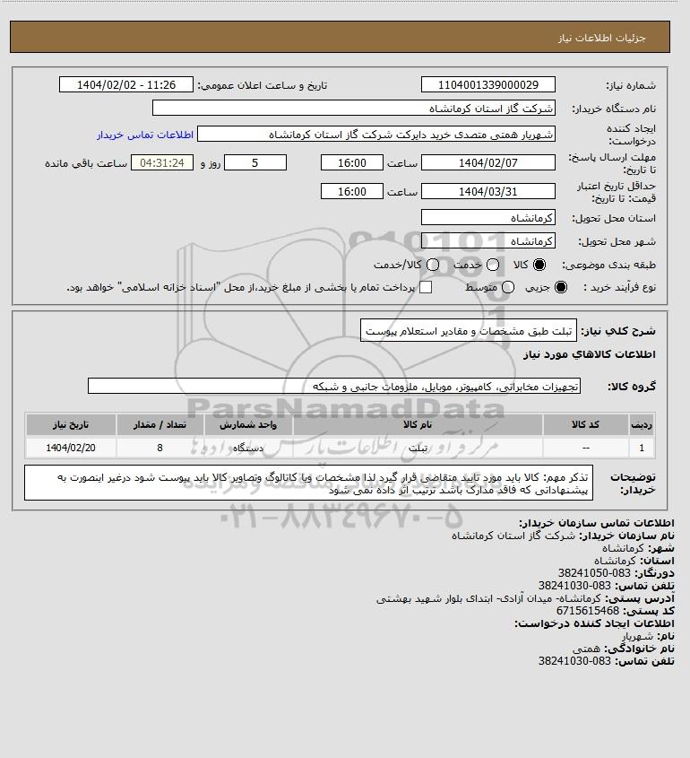 استعلام تبلت طبق مشخصات و مقادیر استعلام پیوست, استعلام تبلت طبق مشخصات و مقادیر استعلام پیوست