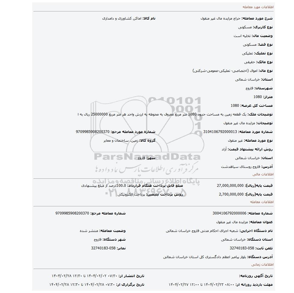 | عنوان معامله: مزایده مال غیر منقول | ||