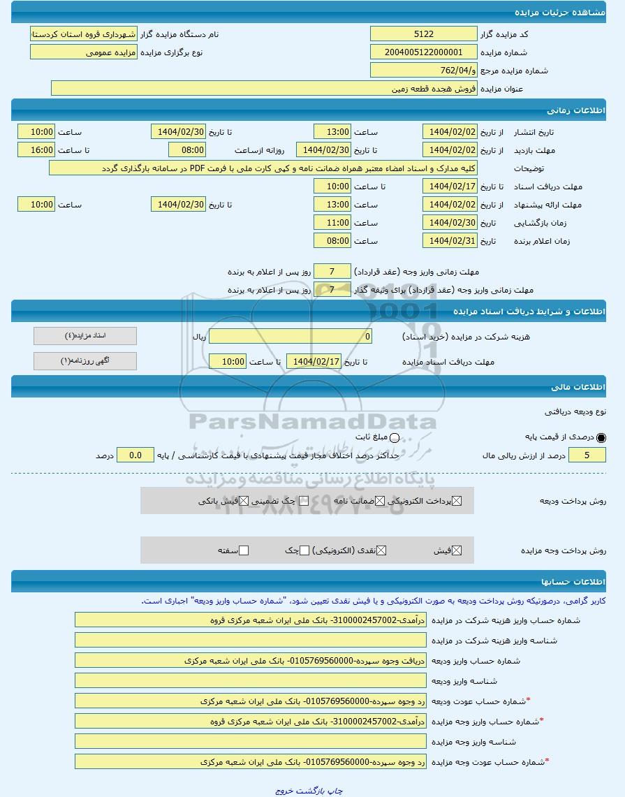 | شماره حساب واریز وجه مزایده | درآمدی-3100002457002- بانک ملی ایران شعبه مرکزی قروه |
