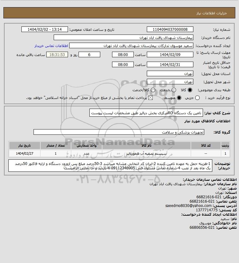 استعلام تامین یک دستگاه ROمرکزی بخش دیالیز طبق مشخصات لیست پیوست, استعلام تامین یک دستگاه ROمرکزی بخش دیالیز طبق مشخصات لیست پیوست