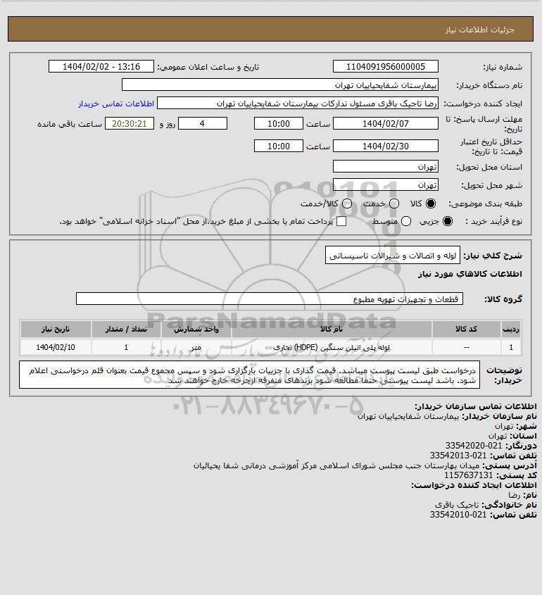 | 1 | -- | لوله پلی اتیلن سنگین (HDPE) تجاری | متر | 1 | 1404/02/10 |