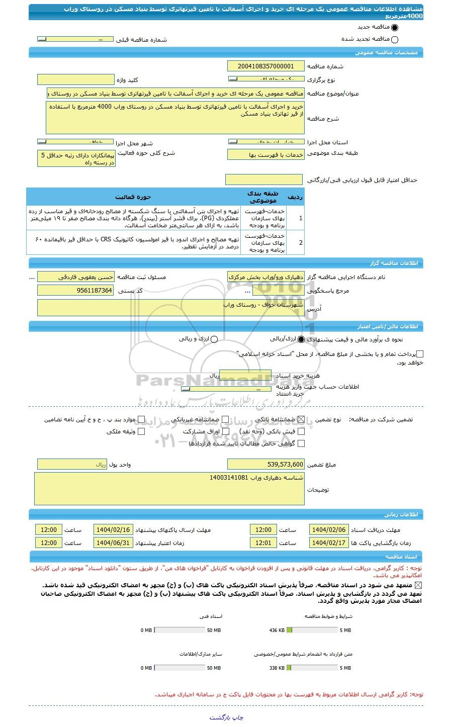 | عنوان/موضوع مناقصه | مناقصه عمومی یک مرحله ای خرید و اجرای آسفالت با تامین قیرتهاتری توسط بنیاد مسکن در روستای وراب 4000مترمربع | |||||||||||