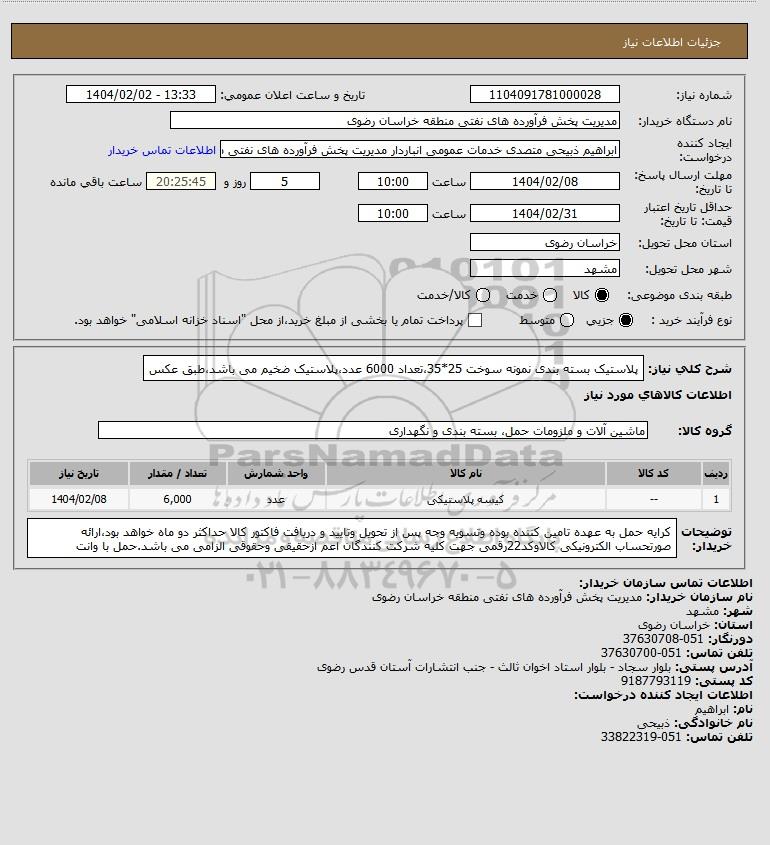 شرح کلی نیاز: پلاستیک بسته بندی نمونه سوخت 25*35،تعداد 6000 عدد،پلاستیک ضخیم می باشد،طبق عکس