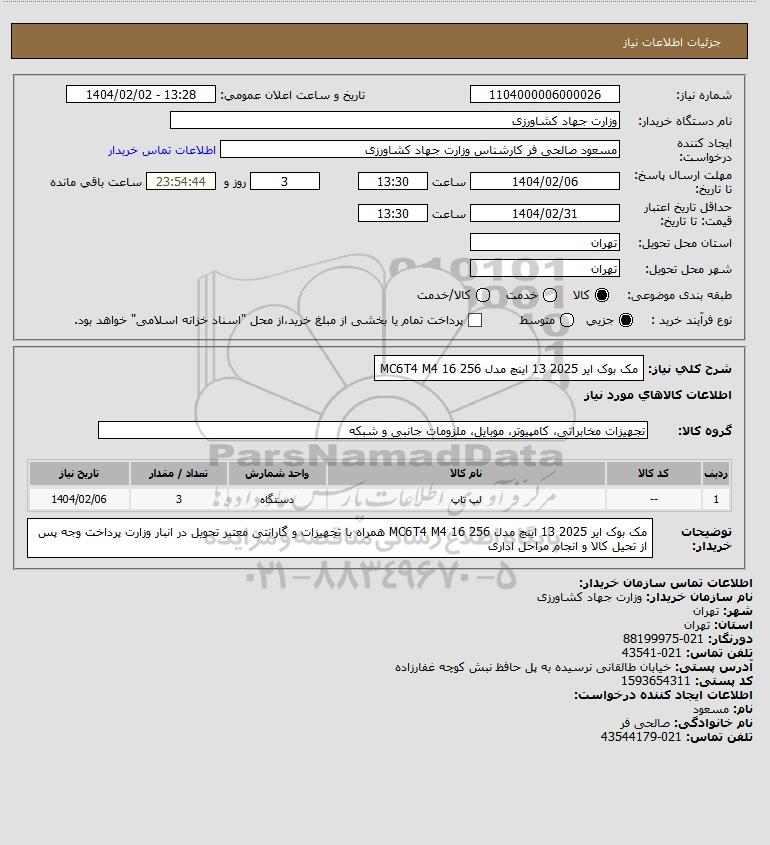 شرح کلی نیاز: مک بوک ایر 2025 13 اینچ مدل MC6T4 M4 16 256