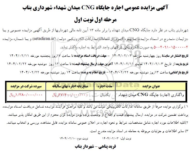 آگهی مزایده عمومی اجاره جایگاه CNG میدان شهداء شهرداری بناب ( مرحله اول نوبت اول)