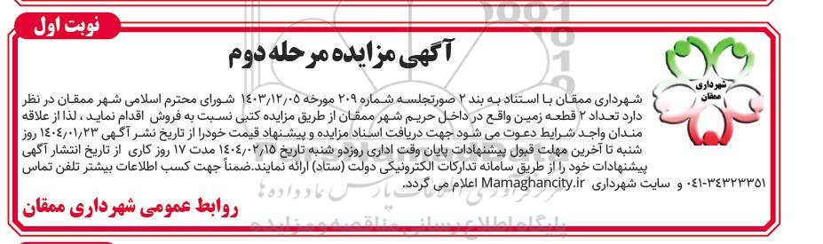 شهرداری ممقان با استناد به بند 2 صورتجلسه شماره 209 مورخه 1403.12.05 شورای محترم اسلامی شهر ممقان در نظر دارد تعداد 2 قطعه زمین واقع در داخل حریم شهر ممقان از طریق مزایده کتبی نسبت به فروش اقدام نماید ، لذا از علاقه مندان واجد شرایط دعوت میشود جهت دریافت اسناد مزایده و پیشنهاد قیمت خود را از تاریخ نشر آگهی 1404.01.23 روز 3شنبه تا آخرین مهلت قبول پیشنهادات پایان وقت اداری روز دوشنبه تاریخ 1404.02.15 مدت70 روز کاری از تاریخ انتشار آگهی پیشنهادات خود را از طریق سامانه تدارکات الکترونیکی دولت ستاد ارائه نمایند. ضمناً جهت کسب اطلاعات بیشتر تلفن تماس 34323351-041 و سایت شهرداری Mamaghancity.ir اعلام می گردد.