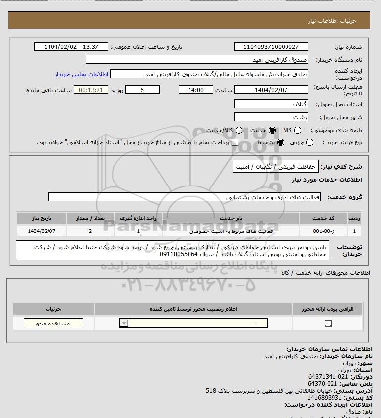 توضیحات خریدار:تامین دو نفر نیروی انسانی حفاظت فیزیکی / مدارک پیوستی رجوع شود / درصد سود شرکت حتما اعلام شود / شرکت حفاظتی و امنیتی بومی استان گیلان باشد / سوال 09118055064