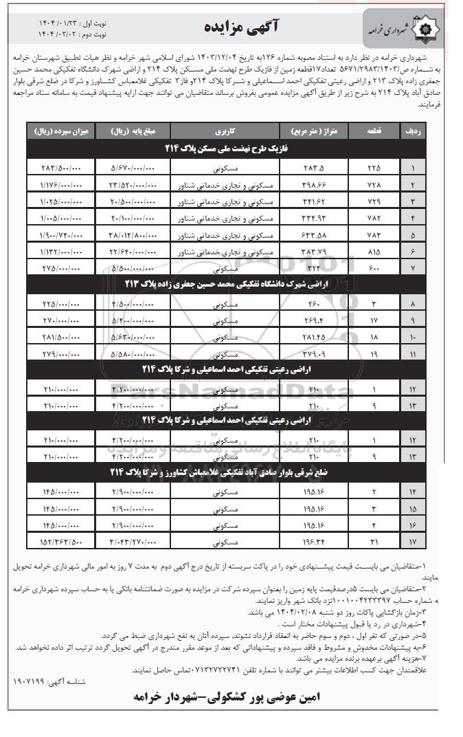 مزایده فروش تعداد 17 قطعه زمین از فاز یک طرح نهضت ملی مسکن پلاک 214 و اراضی شهرک دانشگاه تفکیکی محمد حسین جعفری زاده پلاک 213 و اراضی رعیتی تفکیکی احمد اسماعیلی و شرکا پلاک 214 و فاز 3 تفکیکی غلامعباس کشاورز و شرکا در ضلع شرقی بلوار صادق آباد پلاک 214