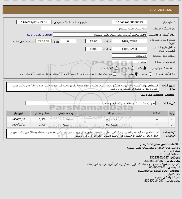 شرح کلی نیاز: استعلام بهای کیسه زباله زرد و مشکی بیمارستان بعثت از مواد درجه یک،پرداخت غیر نقدی و سه ماه به بالا می باشد هزینه حمل و نقل بر عهده فروشنده می باشد
