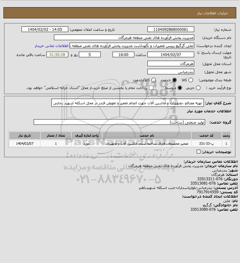 شرح کلی نیاز: تهیه مصالح ،تجهیزات و ماشین آلات جهت انجام تعمیر و تعویض فندر در محل اسکله شهید رجایی